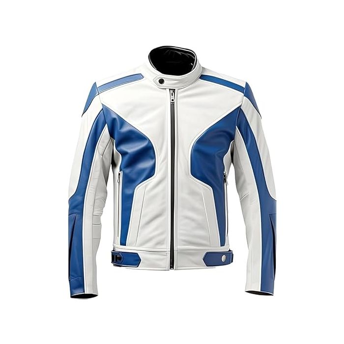 Men’s White and Blue Lambskin Genuine Leather Biker Jacket