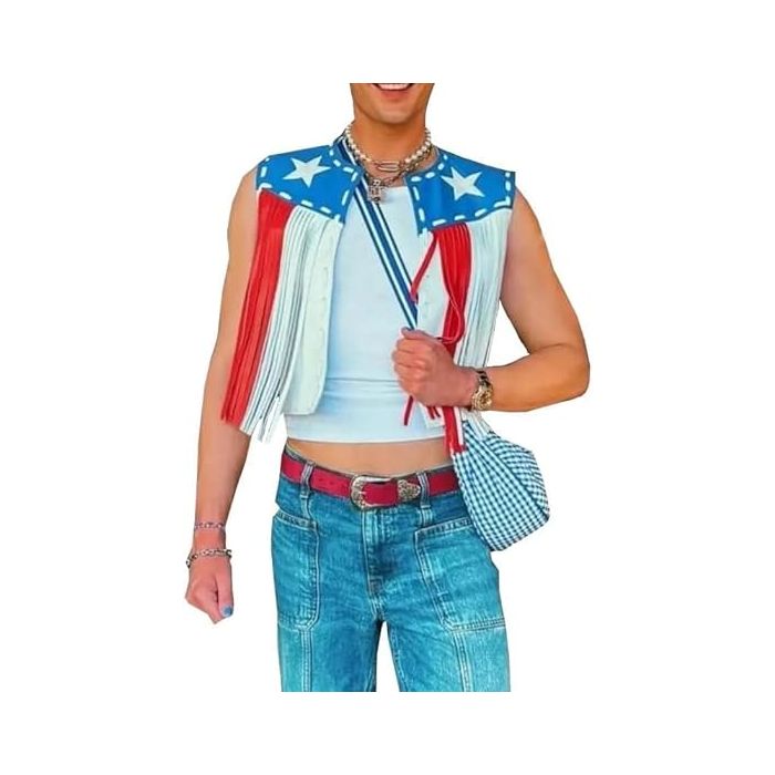 Leather Fringe Vest, American Flag Design, Western Cowboy Style, Unisex - White/Blue