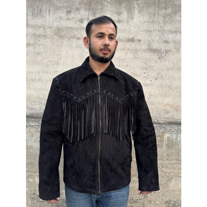 Men's Native American Suede Leather Jacket with Fringes & Zipper